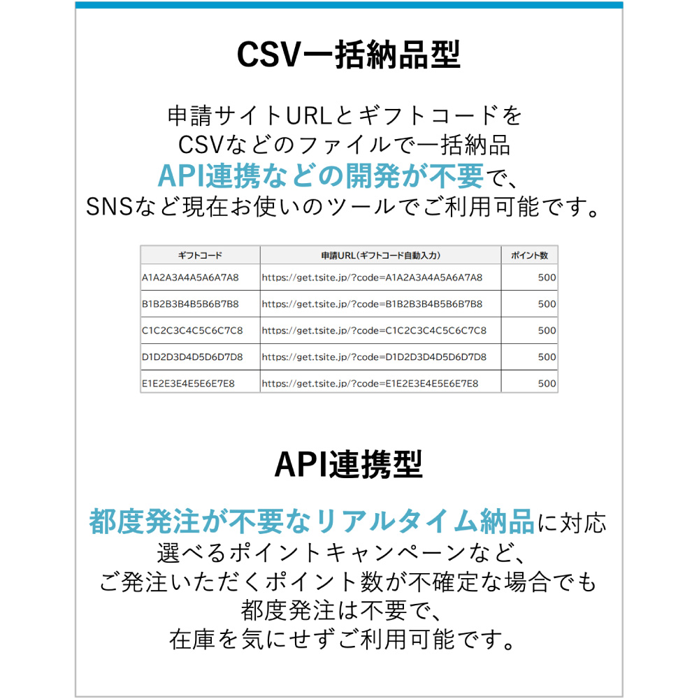 - ギフトコードは「CSV一括納品型」にて提供